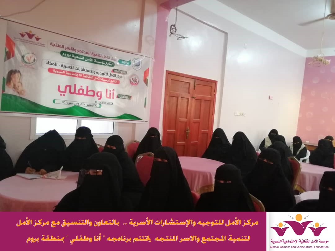 اُختتم مساء يوم الأربعاء بمركز الأمل لتنمية المجتمع والأسر المنتجة بمنطقة بروم برنامج *انا وطفلي * والذي ينفذه مركز الأمل للتوجيه والإستشارات الأسرية التابع لمؤسسة الأمل الثقافية الاجتماعية النسوية بالتعاون والتنسيق مع مركز الأمل لتنمية المجتمع والأسر المنتجة..