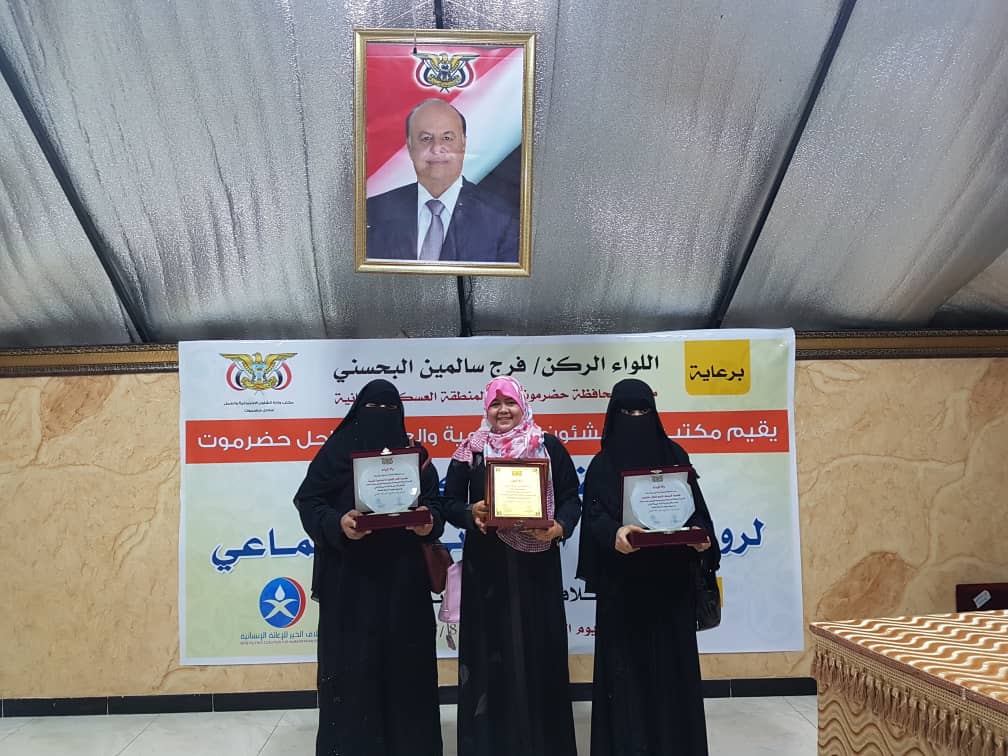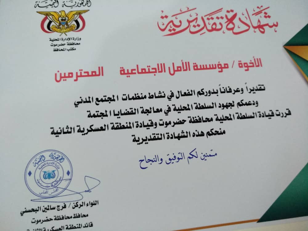 كرمت السلطة المحلية ممثلة باللواء الركن فرج سالمين البحسني محافظ محافظة حضرموت قائد المنطقة العسكرية الثانية يوم الأربعا27/2/2019م مؤسسة الأمل الثقافية الاجتماعية النسوية وعدد من منظمات المجتمع المدني .