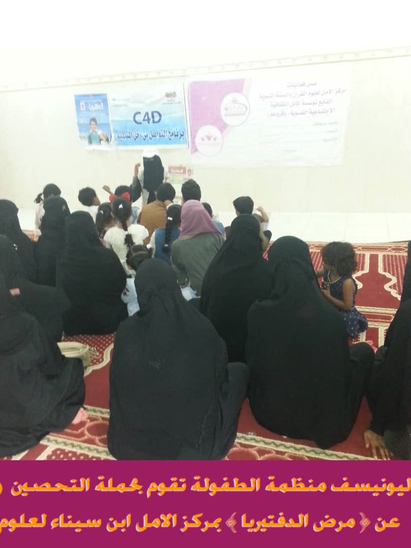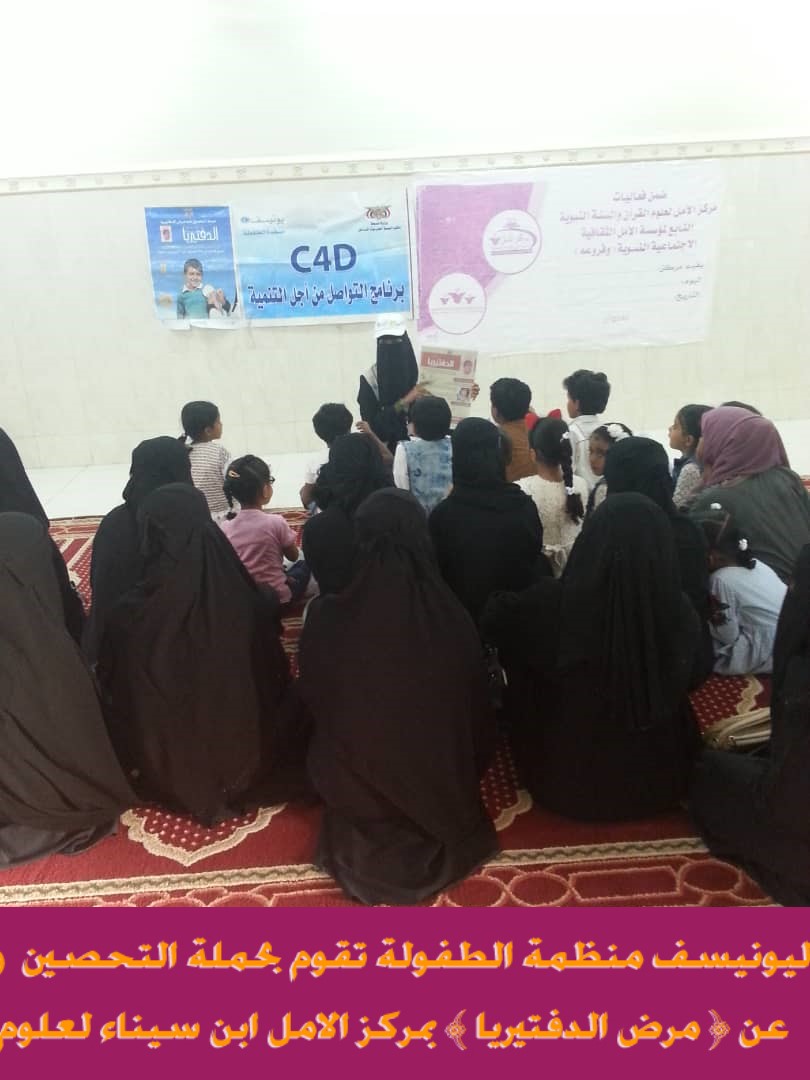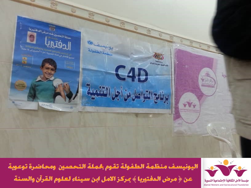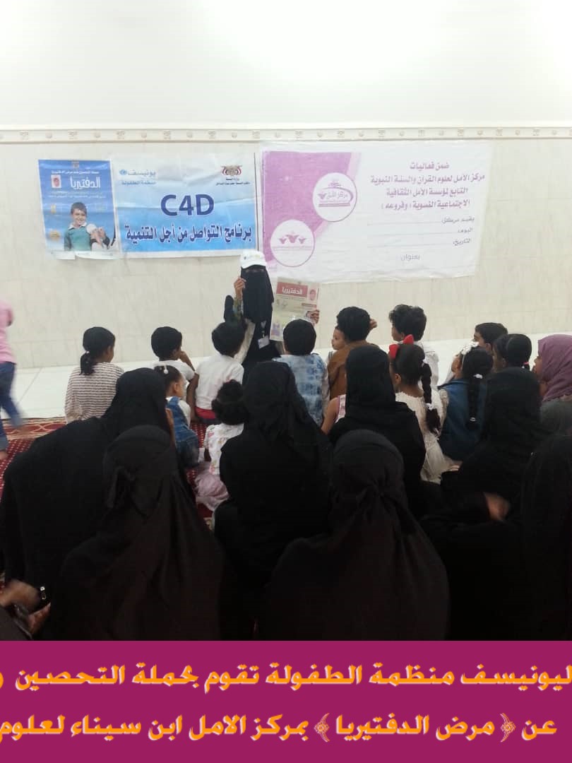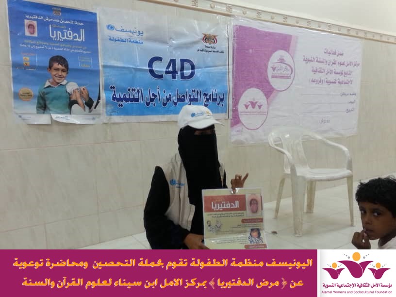 ضمن برنامج التواصل من اجل التنمية اقامت اليونيسف منظمة الطفولة حملة التحصين ضد ( مرض الدفتيريا )وذلك صباح يوم الخميس الموافق 28/11/2019م بمقر مركز الامل لعلوم القران في ابن سيناء التابع لمؤسسة الأمل الثقافية الاجتماعية النسوية