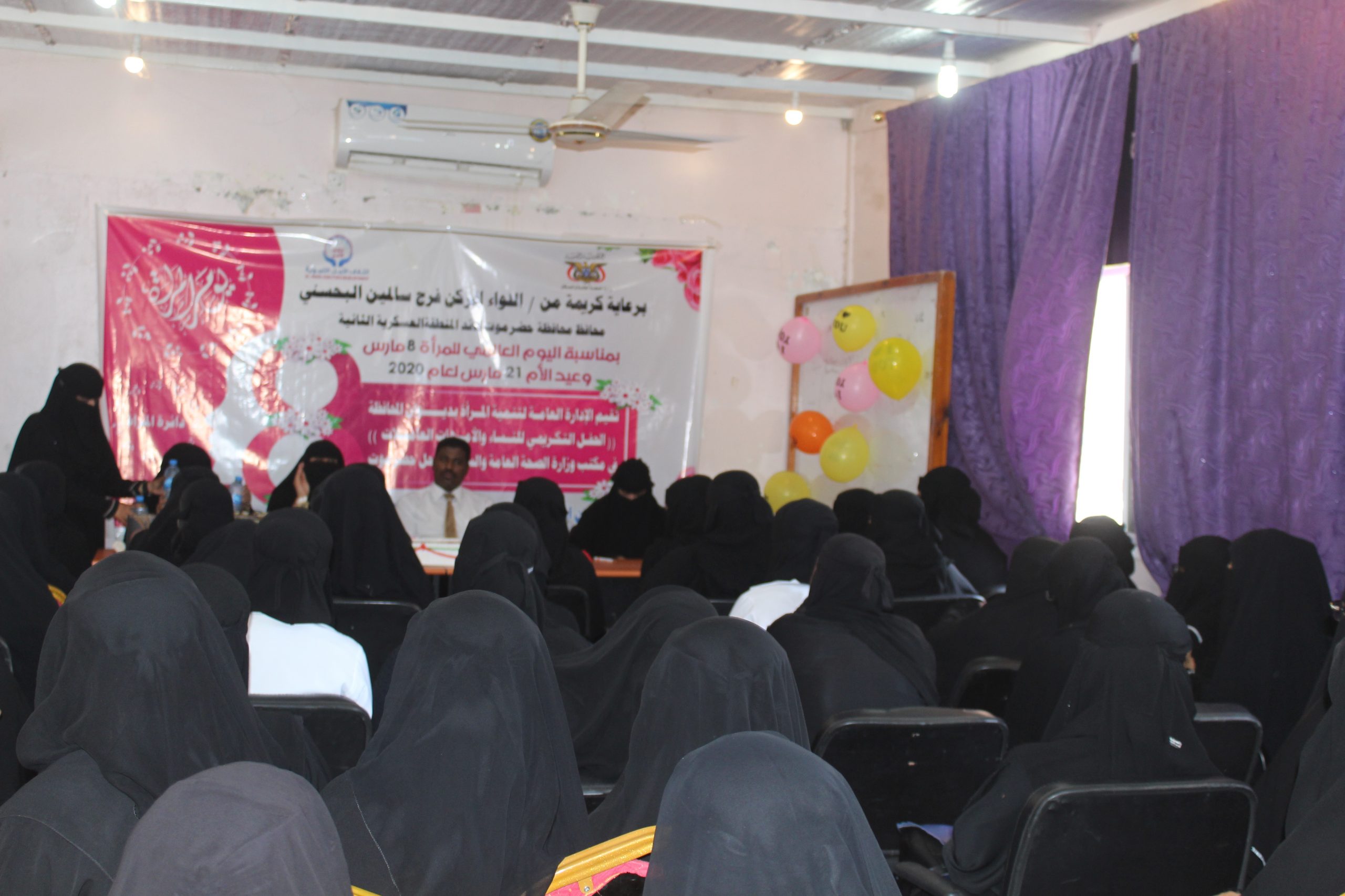 65 من النساء والأمهات العاملات بمكتب الصحة والسكان ساحل حضرموت في قاعة التدريب بمستشفى المكلا للأمومة والطفولة بدعم إئتلاف الأمل التنموية للأعمال الإنسانية وجاء هذا التكريم إحتفاءً باليوم العالمي للمرأة 8 / مارس وتزامناً مع يوم عيد الأم الذي يصادف 21 / مارس ..