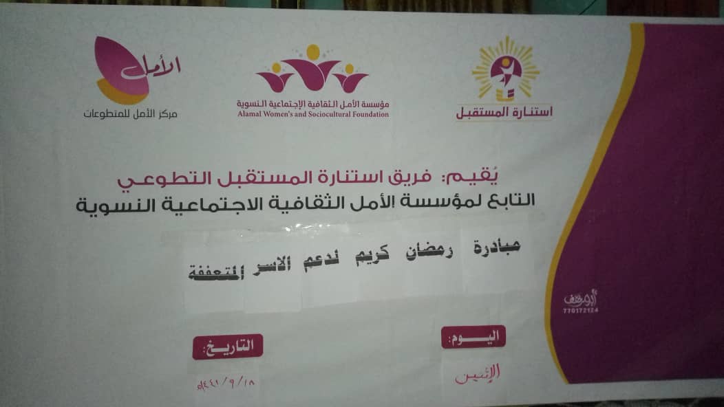 دشن فريق استنارة المستقبل التطوعي التابع لمؤسسة الأمل الثقافية الإجتماعية النسوية ومركز الأمل للمتطوعات، مبادرة رمضان كريم للأسرة الفقيرة والمحتاجة بمنطقة ريدة الجوهيين بمديرية غيل بن يمين بدعم من فاعل خير.