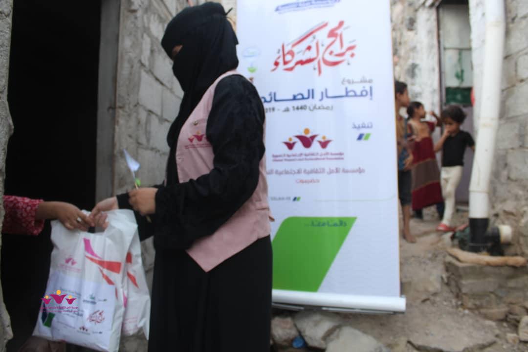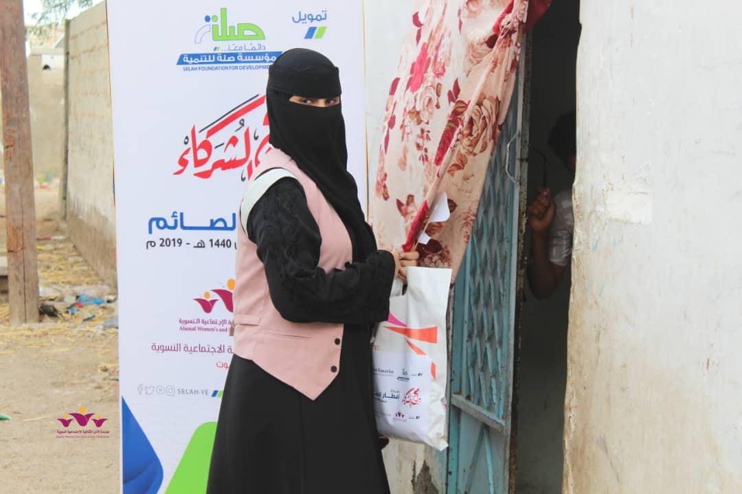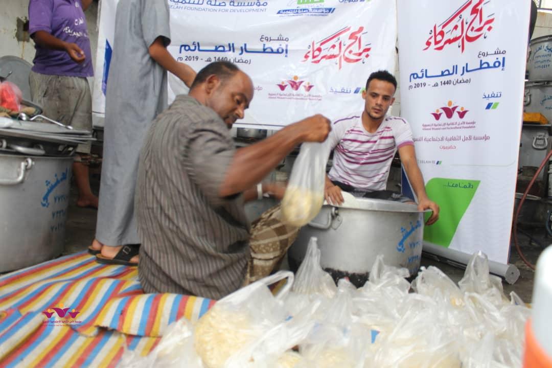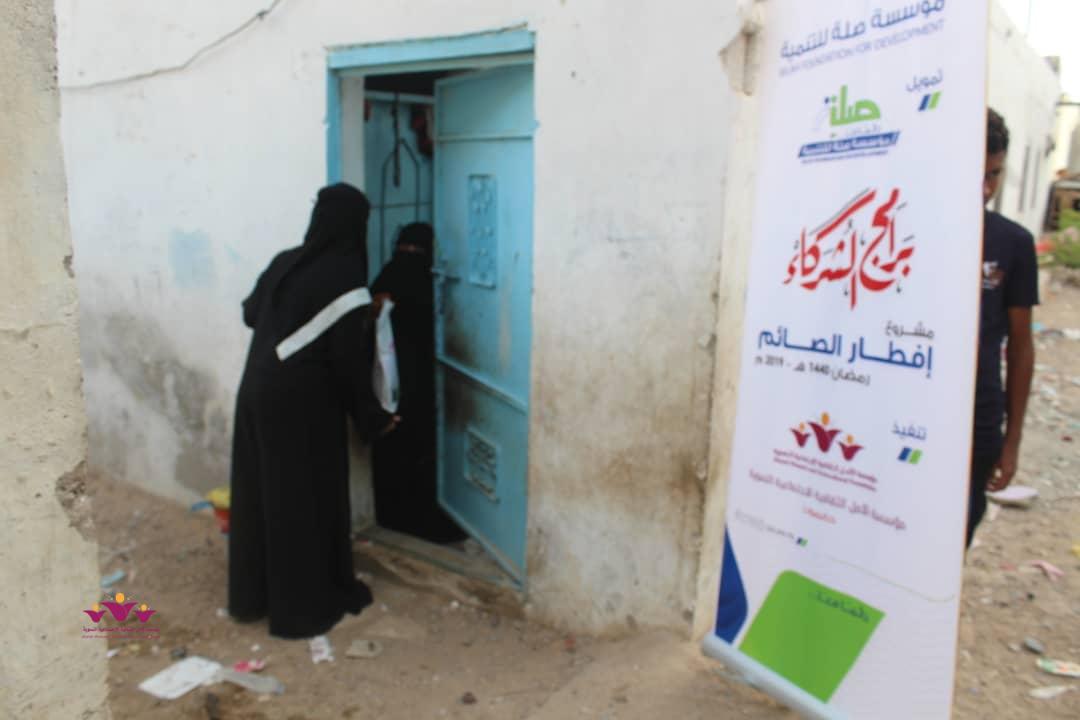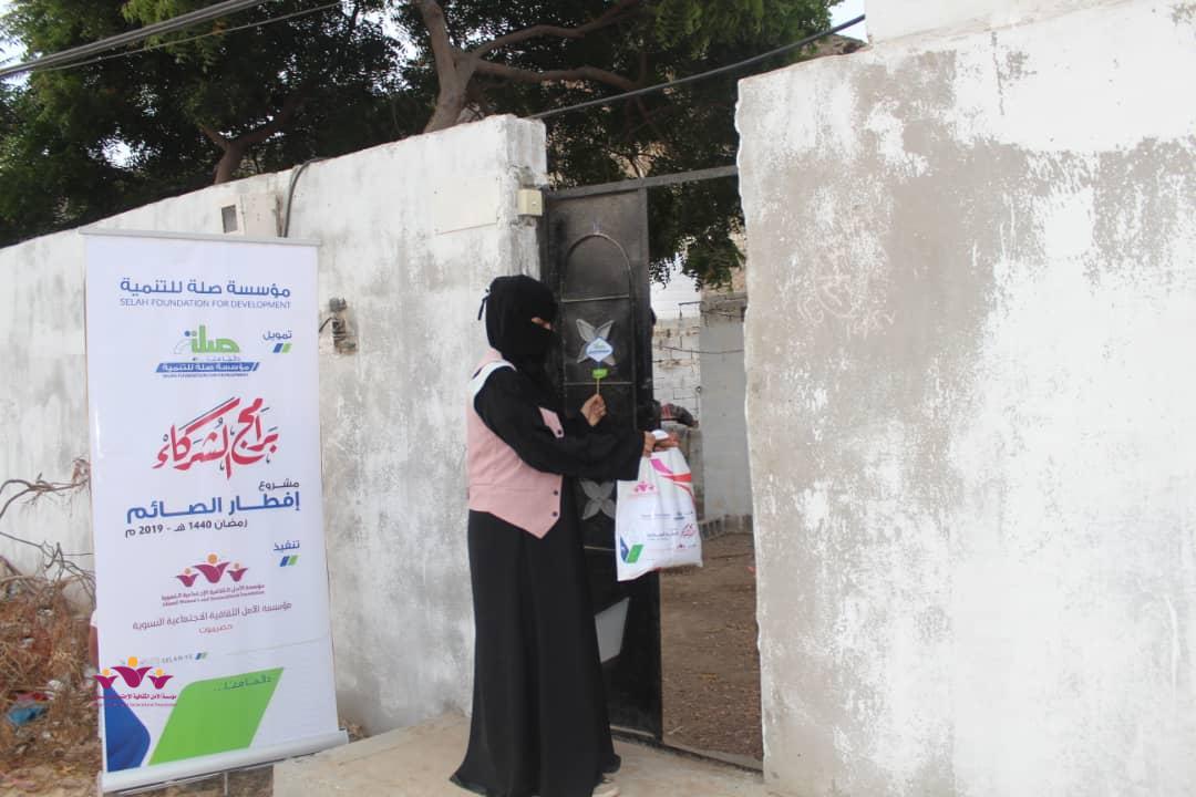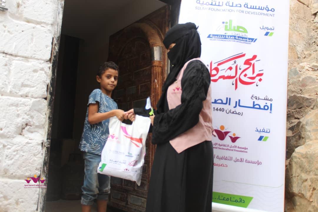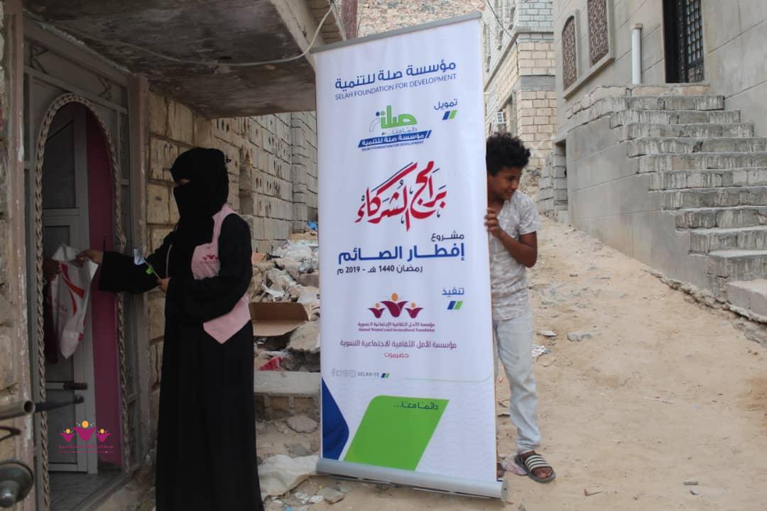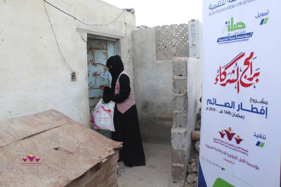 تواصل مؤسسة الأمل الثقافية الاجتماعية النسوية تنفيذ مشروعها الموسمي الخيري الرمضاني (إفطار الصائم ” في إطار التعاون المشترك الذي يجمعها مع مؤسسة صلة للتنمية ضمن برنامج ( شركاء) .. حيث وزعت المؤسسة يوم أمس الثلاثاء 22/مايو/2019 م وجبات “إفطار الصائم” الطازجة على 200 أسرة من أسر النازحين في حارات منطقة خلف بمدينة المكلا بدعم وتمويل من مؤسسة صلة للتنمية .