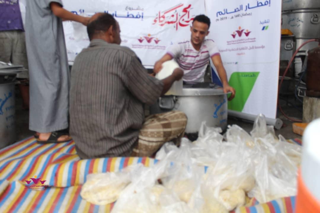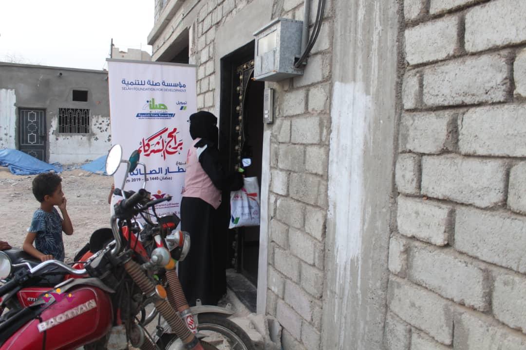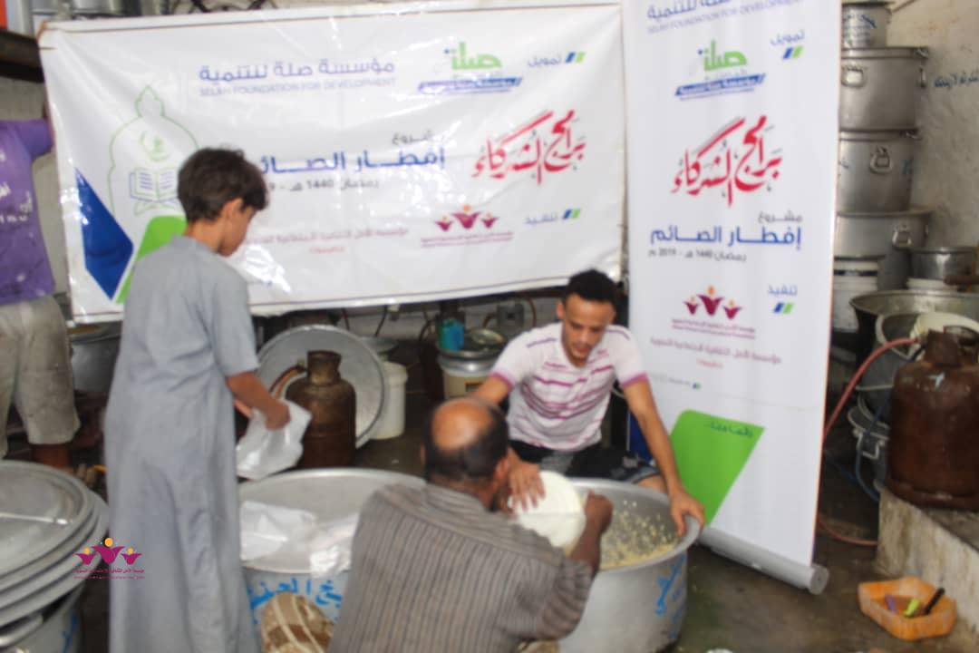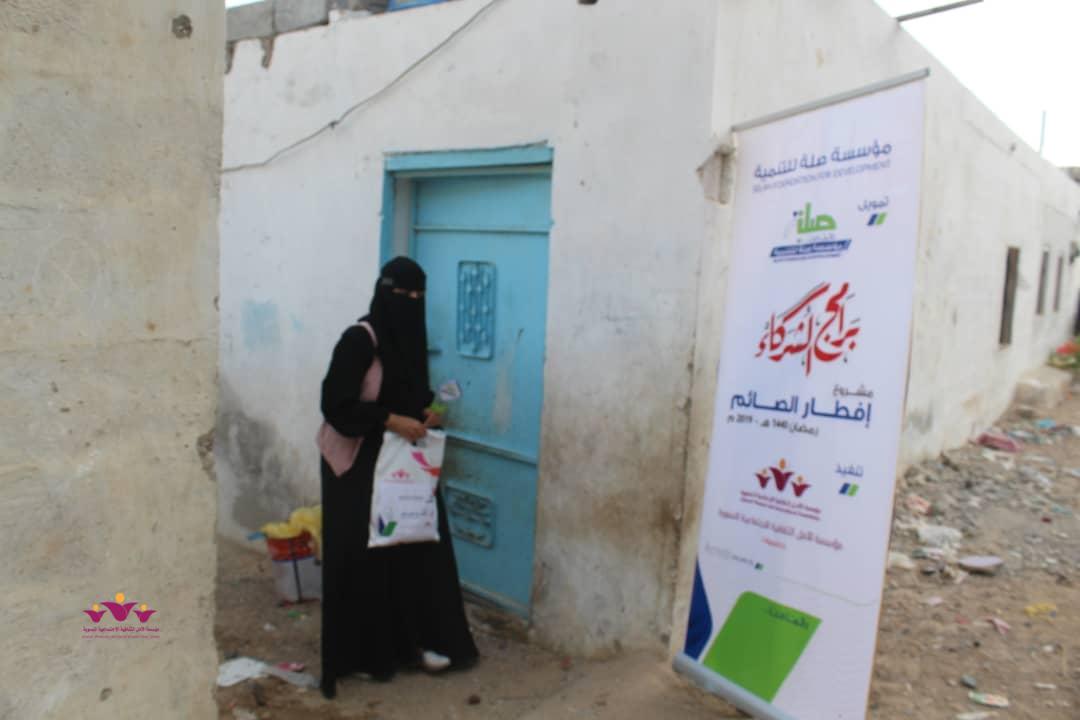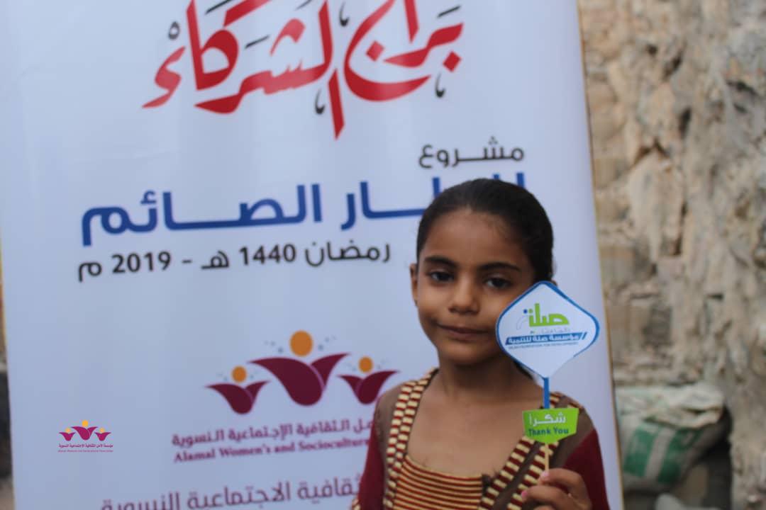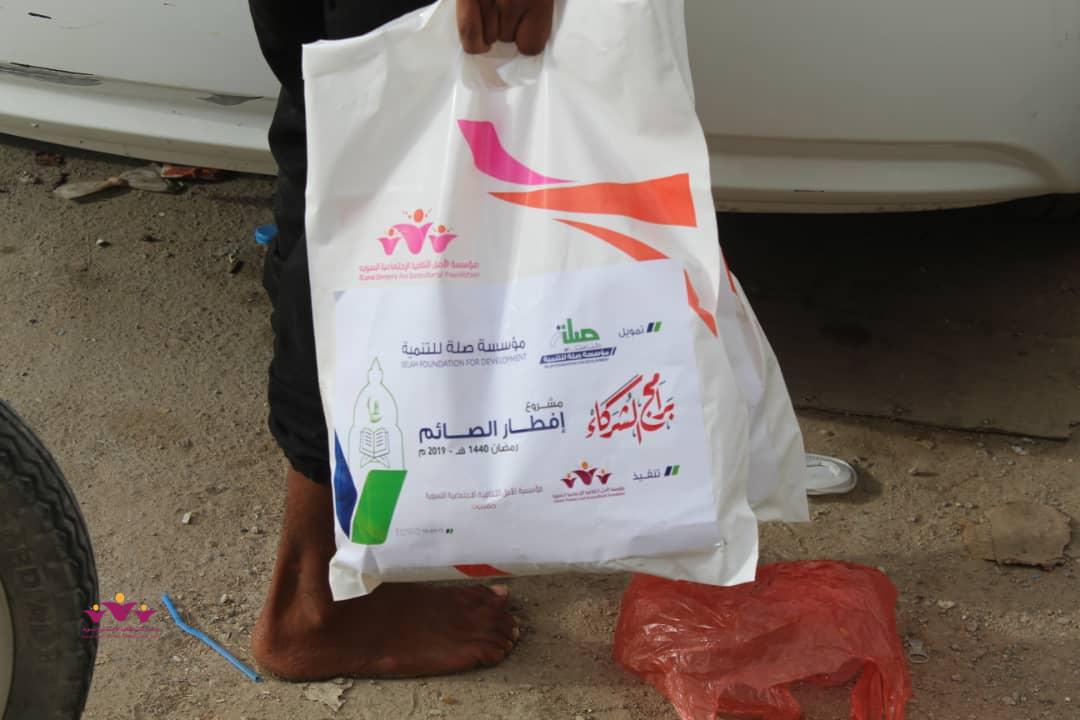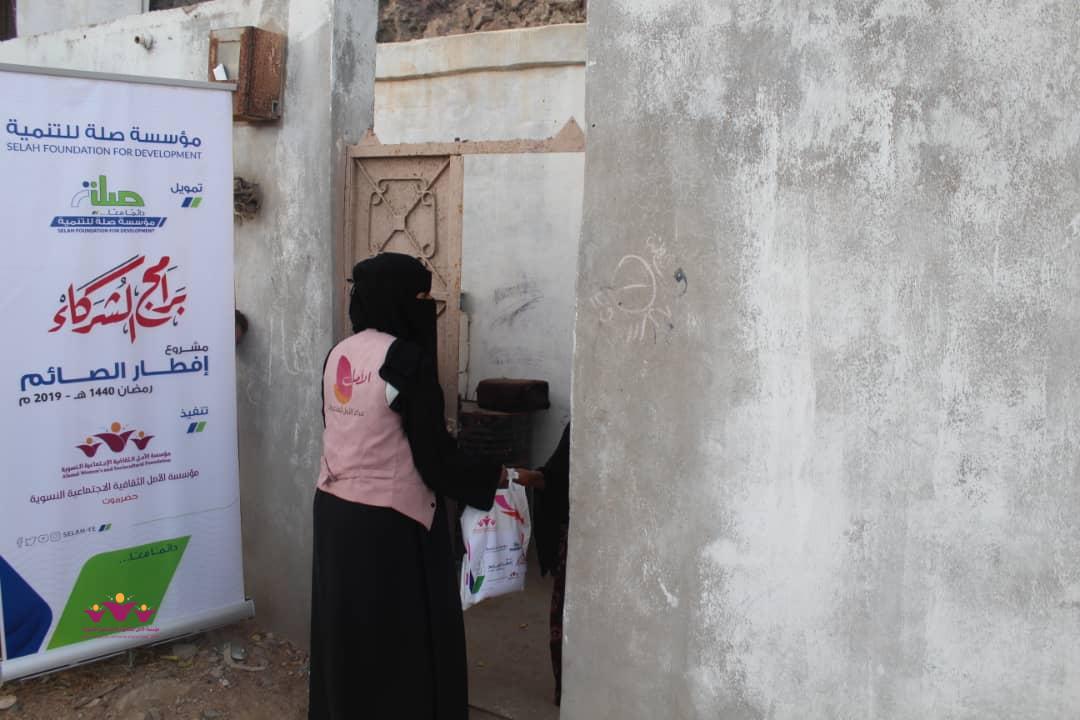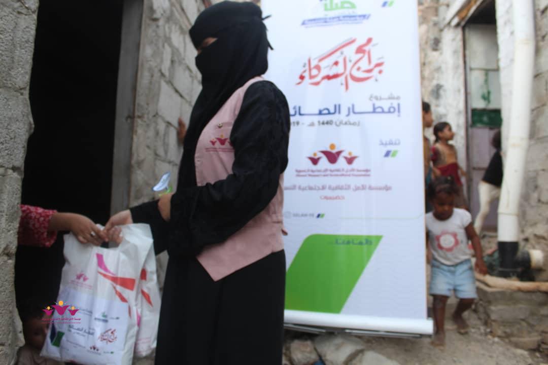 تواصل مؤسسة الأمل الثقافية الاجتماعية النسوية تنفيذ مشروعها الموسمي الخيري الرمضاني (إفطار الصائم ” في إطار التعاون المشترك الذي يجمعها مع مؤسسة صلة للتنمية ضمن برنامج ( شركاء) .. حيث وزعت المؤسسة يوم أمس الثلاثاء 22/مايو/2019 م وجبات “إفطار الصائم” الطازجة على 200 أسرة من أسر النازحين في حارات منطقة خلف بمدينة المكلا بدعم وتمويل من مؤسسة صلة للتنمية .