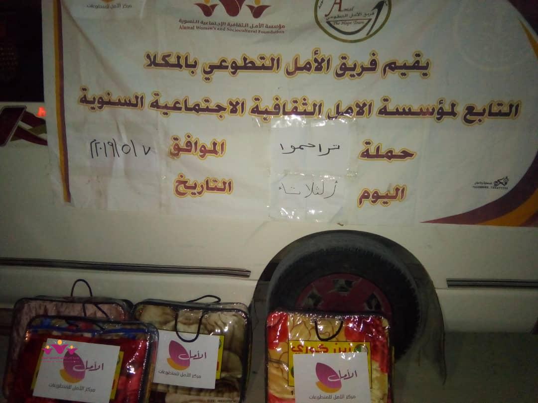 وزع مركز الأمل للمتطوعات بالتعاون مع فريق الأمل التطوعي بالمكلا التابعين لمؤسسة الأمل الثقافية الاجتماعية النسوية يوم أمس الثلاثاء. م ٧/٥/٢٠١٩ عدد من البطانيات لسكان منطقة العشوائي بفوة مديرية مدينة المكلا بدعم وتمويل من مؤسسة الأمل النسوية .. وأستهدف التوزيع الذي كان تحت شعار ” تراحموا” حوالى ٢٠ شخص من المحتاجين والمعوزين تزامنا مع حلول شهر رمضان الكريم .. وقد عبر المستفيدون عن بالغ سعادتهم وإمتنانهم مقدمين الشكر والتقدير للمؤسسة التي دائما ماتكون السباقة إلى هذه الأعمال الخيرية الرمضانية .