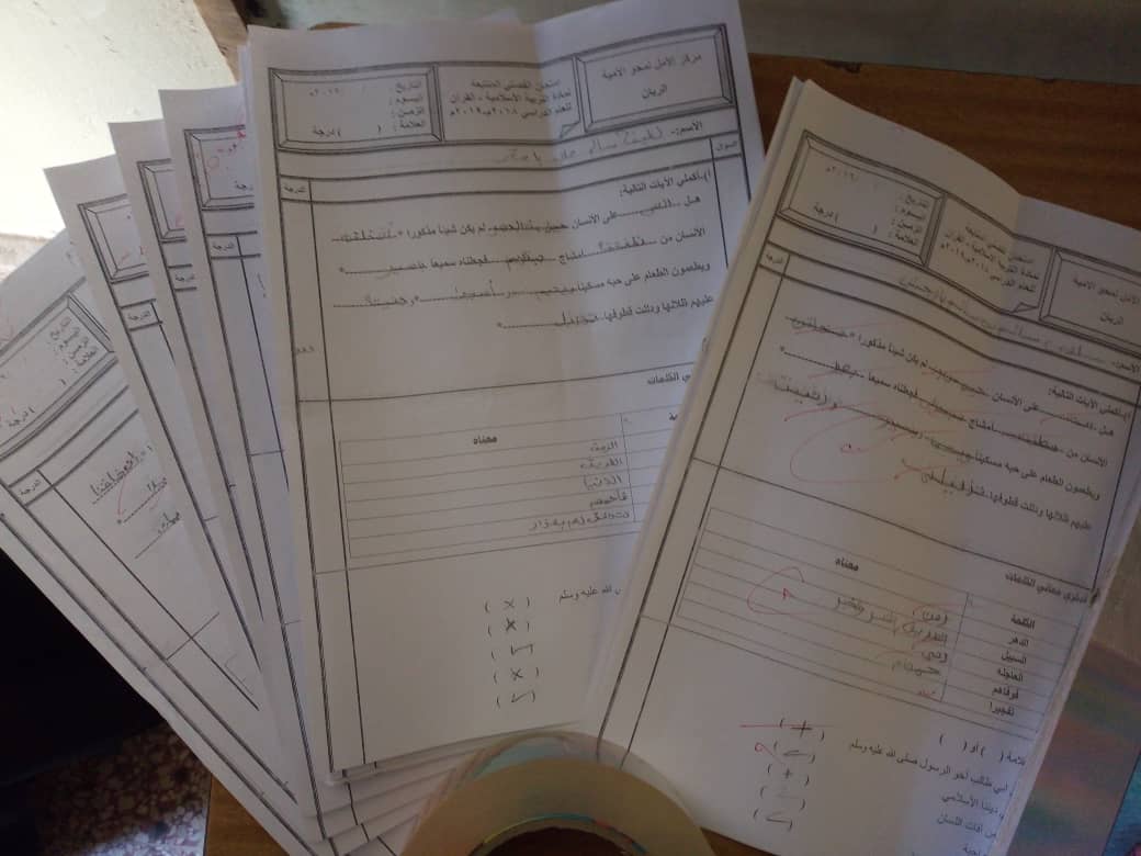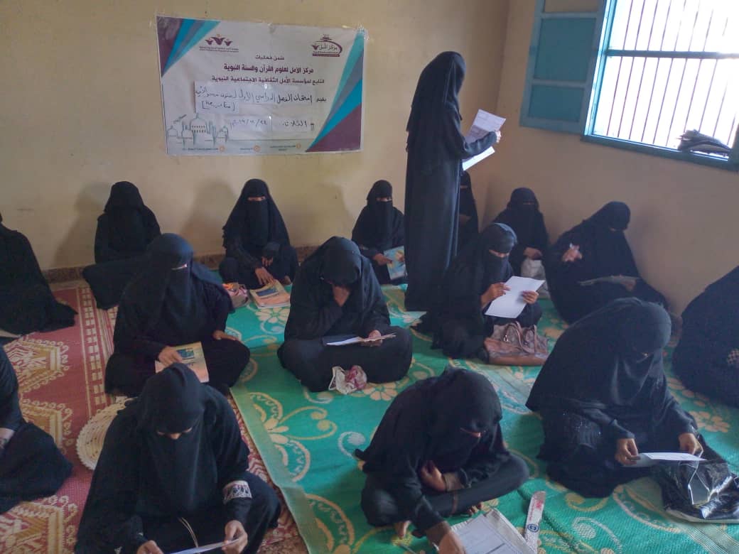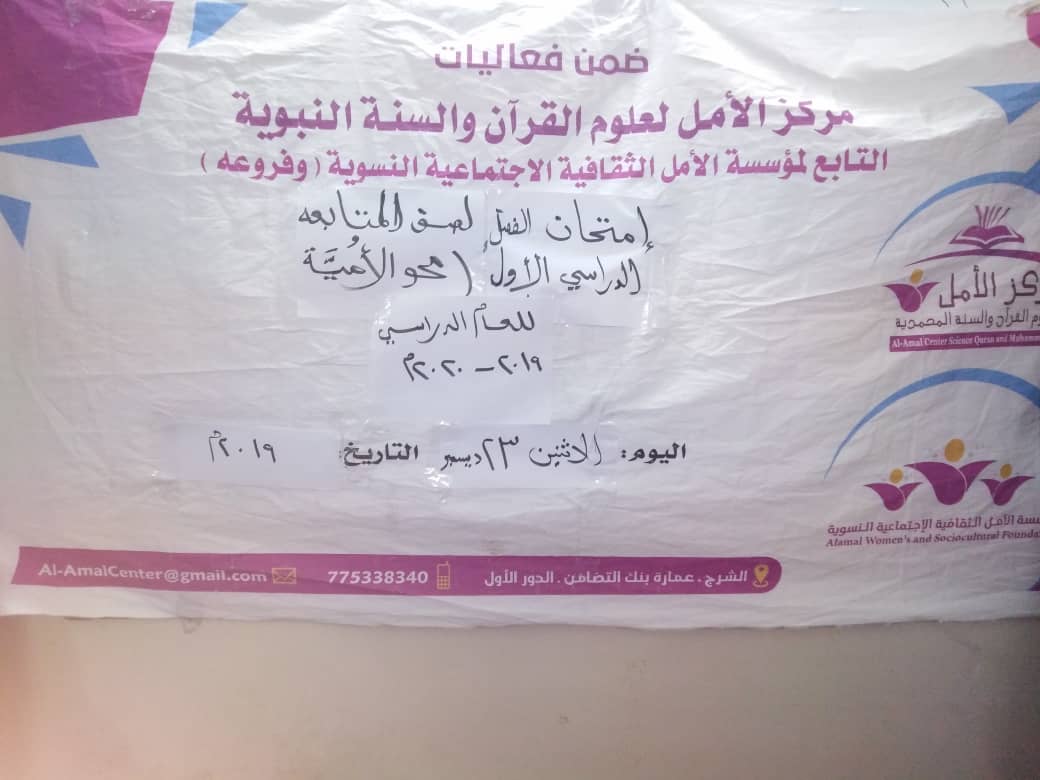 على مدى اربعة ايام متتالية نفذ مركز الامل بالريان ومركز الامل بالشرج امتحانات الفصل الدراسي الاول بدا من يوم الاثنين 23/12/2019م إلى يوم الخميس 26/12/2019م لصفوف محو الامية للسنة الثالثة حيث تم التحضير لها مسبقا من قبل معلمتي الصفين أ/ الغصين الكلدي بالريان أ/صوفيا بابقي بالشرج حيث كانت تحت اشراف أ/ احلام باغزال