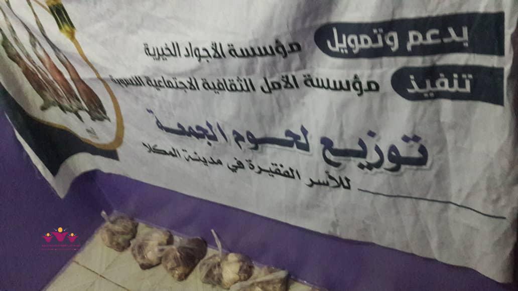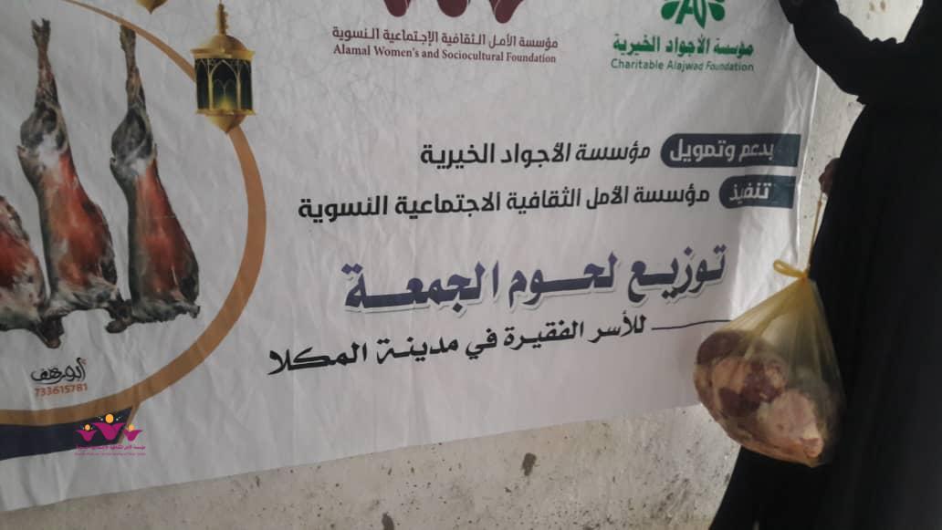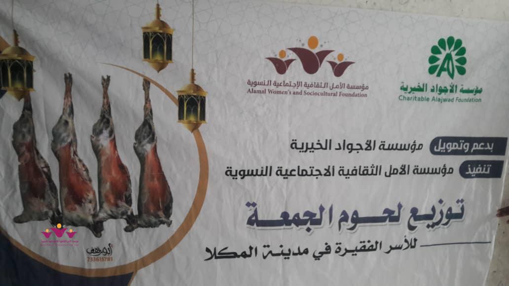 قام فريق الأمل فينا التابع لمؤسسة الأمل الثقافية الاجتماعية النسوية يوم الجمعة 24/مايو/2019م بحملة توزيع التمور ولحوم الجمعة على عشر من الأسر المحتاجة والمعوزة في حي المنقد بمنطقة الشرج بدعم من مؤسسة الأمل وفاعلي خير.. وتأتي عملية التوزيع في إطار جملة من المشاريع الرمضانية الخيرية التي تعمل المؤسسة وفرقها على تأمينها للأسر المحتاجة إنطلاقا من حرصها الدائم على تقديم الدعم والمساعدة لهذه الأسر وإقتداء بتعاليم ديننا الحنيف لترسيخ مبدأ التكافل الاجتماعي وتيمنا بسنة رسول الله عليه الصلاة والسلام .