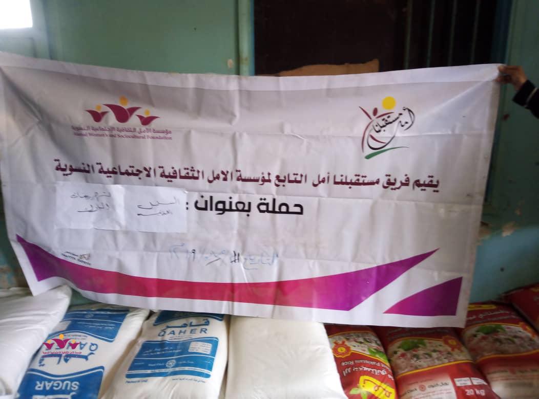 وزع فريق مستقبلنا أمل التابع لمؤسسة الأمل الثقافية الاجتماعية النسوية وعلى مدى ثلاثة أيام متتالية عدد (35) سلة غذائية على عدد من الأسر المحتاجة والمعوزة في كل من مدن المكلا ، غيل باوزير ، شحير ومنطقة الريان بدعم وتمويل من قبل مؤسسة الأمل .