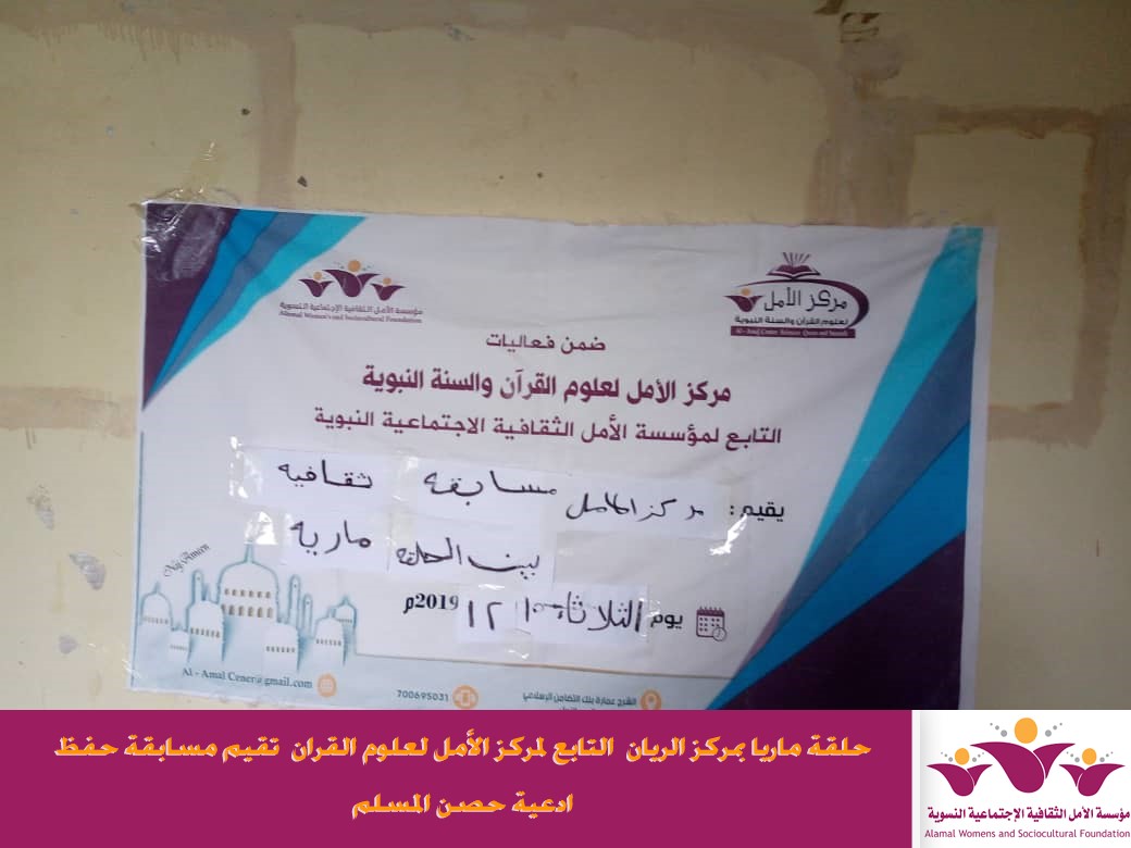 اقام مركز الريان احد افرع مركز الأمل لعلوم القران التابع لمؤسسة الأمل الثقافية الاجتماعية النسوية مسابقة في حفظ ادعية حصن المسلم بين طالبات حلقة ماريا وذلك يوم الثلاثاء الموافق 10/12/2019م