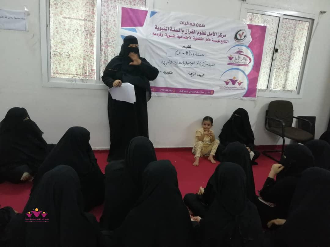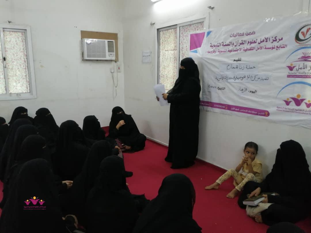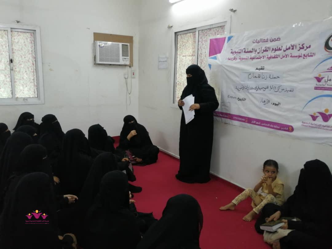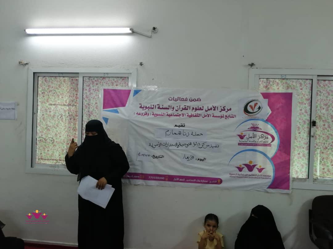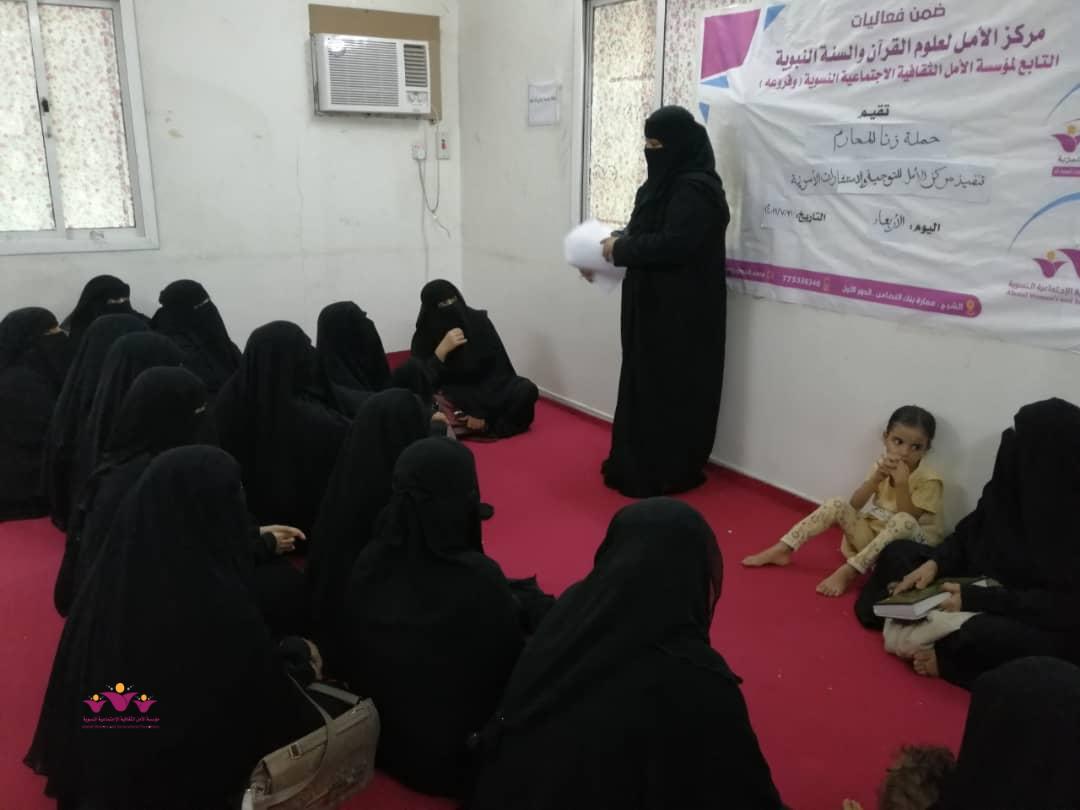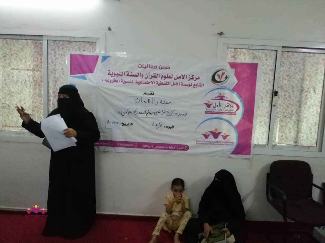 دشن مركز الامل لتوجيه والاستشارات الأسرية التابع لمؤسسة الامل الثقافية الاجتماعية النسوية عصر يوم الاربعاء الموافق 31/7/2019 فعاليات البرنامج التوعوي الإرشادي للحد من الزنا والفواحش . وفي التدشين أوضحت الاخصائية الاجتماعية صابرين المشجري ضرورة مكافحة الطرق والسبل التي تؤدي إلى انتشار الرذيلة وتساعد على انتشار الزنا ومنها زنا المحارم الذي بدأت بعض ظواهره بالبروز في المجتمع الحضرمي بتسجيل حالات زنا المحارم في مراكز الامن . ويتضمن البرنامج محاضرات حول المفاهيم الدينية والضوابط التي تحد من انتشار هذه الظاهرة المحرمة في المجتمع ويهدف البرنامج إلى توعية النساء والإناث عن مخاطر زنا المحارم ويسعى إلى الحد من هذه الظاهرة في المجتمع استفاد من المحاضر ة عدد 25 من النساء