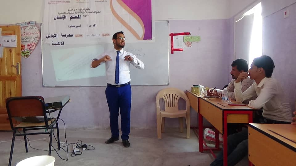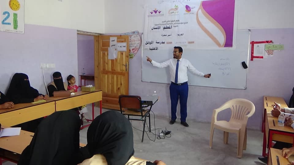 نفذ صباح اليوم الثلاثاء الموافق 2/4/2019فريق أيادي الخير التابع لمؤسسة الأمل الثقافية النسوية بالمهرة بمدرسة الأوائل بالعاصمة الغيضة ندوة تربوية تثقيفية لعدد (19)من فريق أيادي الخير و معلمي ومعلمات المدرسة بأشراف و تدريب المدرب الدولي أمير شحرة. تناولت الفعالية الصباحية موضوعات ثرية متنوعة فيما يتعلق بأستحداث طرق و أساليب نموذجية إيجابية لشخصية المعلم المحترف و الى أهمية الاخلاص و تطوير الأداء في العملية التعليمية والتربوية معتبرا أمير شحرة الحب والعاطفة والهيبة صفات يجي امتلاكها بالمعلمين لتعليم الطلاب.