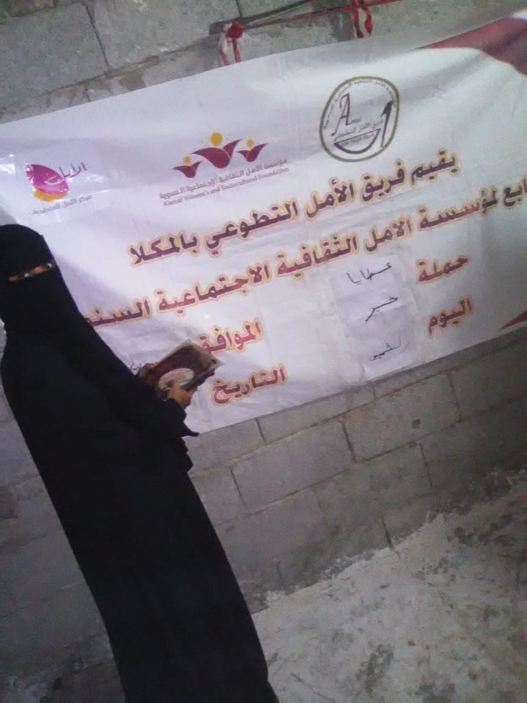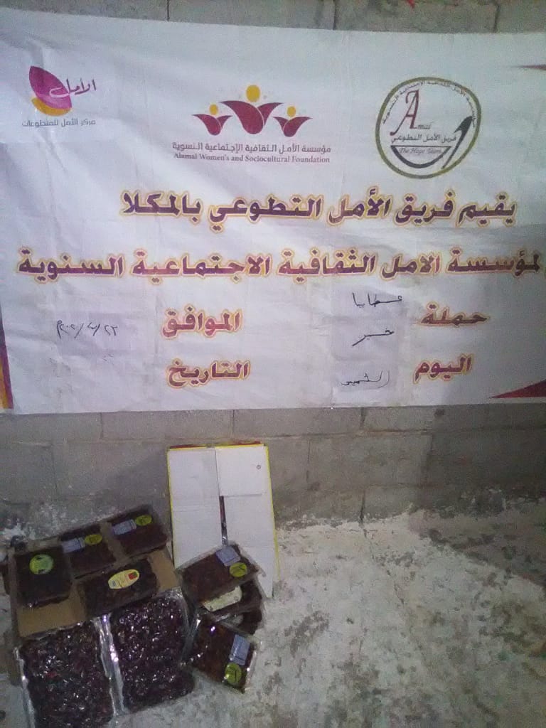 قام فريق الأمل التطوعي بالمكلا التابع لمؤسسة الأمل الثقافية الاجتماعية النسوية يوم أمس الخميس بتنفيذ حملتة الرمضانية تحت شعار ” عطايا خير” والمتمثلة في توزيع التمور لعدد من أسر منطقة الخزان حي الشرج بمدينة المكلا المحتاجة