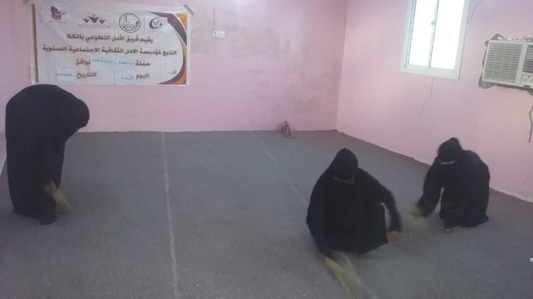 أقام فريق الأمل التطوعي بالمكلا التابع لمؤسسة الأمل الثقافية الجتماعية النسوية يوم أمس الجمعة 8/2/2019 بحملة تنظيف عامة إستهدفت باحة مصلى النساء بمسجد الرحمة في منطقة الحرشيات بمديرية المكلا .. وقد أثار ذلك الفعل الخيري إرتياح بالغ لدى عامة رواد المسجد وسكان المنطقة متمنين من الله العلي القدير إن يجعل ذلك في ميزان حسناتهم من جانبهن عبرن المشاركات في حملة التنظيف عن سعادتهن لعمل هذا الفعل الذي يهدف الى خدمة بيوت الله ودعوة الآخرين للإسهام والمبادرة الى الإهتمام بنظافة بيوت الله والحفاظ على نظافتهم .