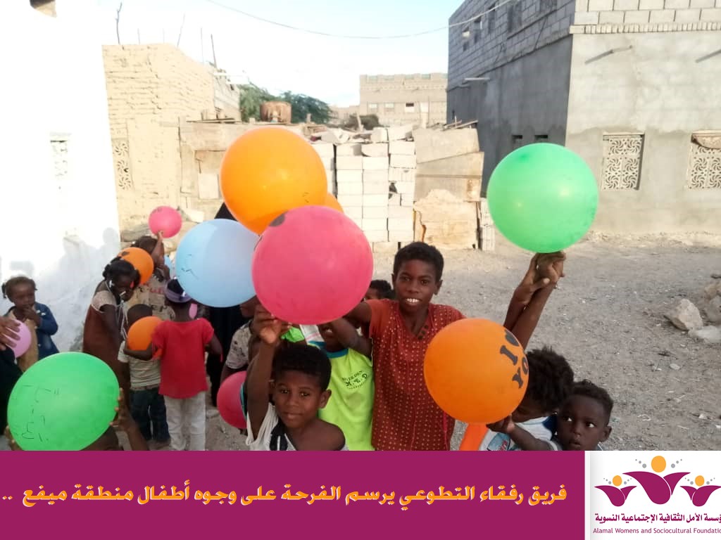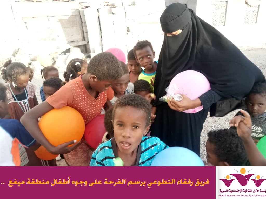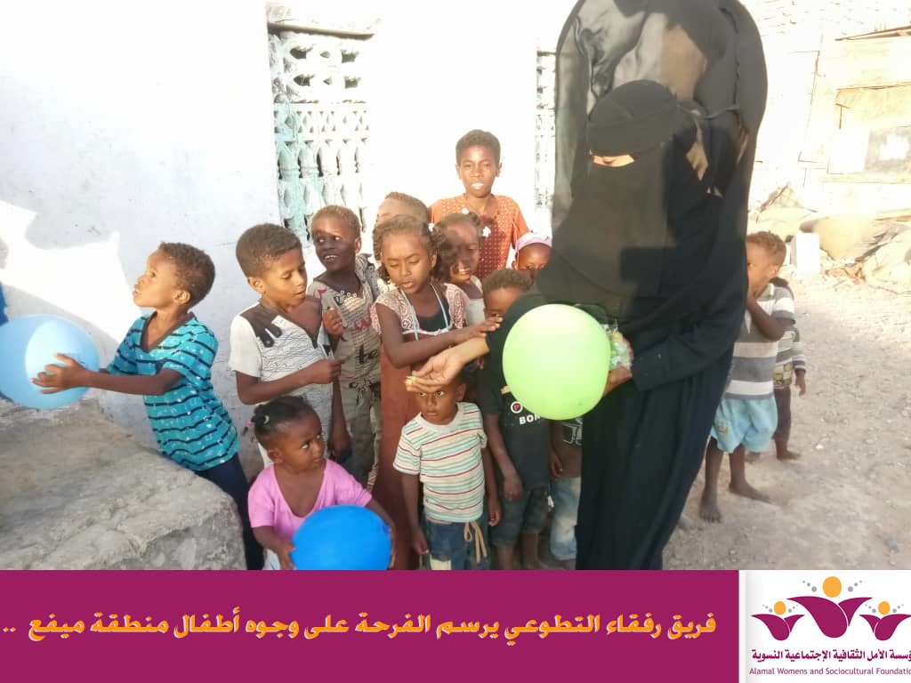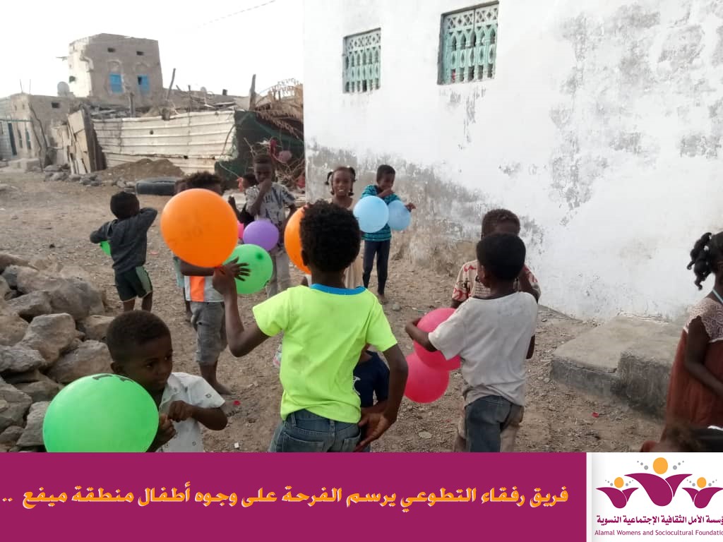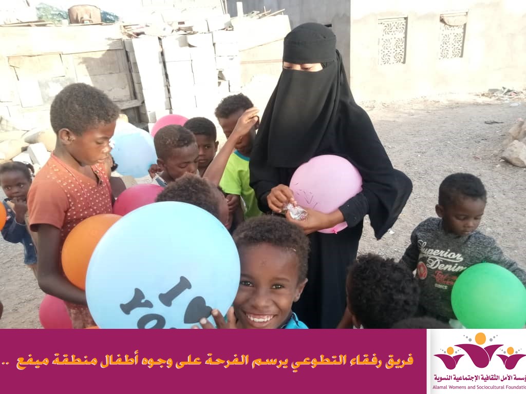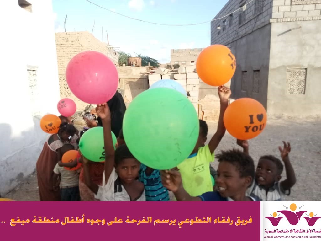 قام فريق رفقاء التطوعي التابع لمؤسسة الأمل الثقافية الاجتماعية النسوية يوم السبت الماضي يتنفيذ فعالية تطوعية إشتملت على توزيع عدد من البالونات وقطع الشوكولاتة استهدفت أطفال منطقة ميفع السفال بمديرية بروم ميفع بدعم وتمويل من الفريق وفاعلي الخير..
