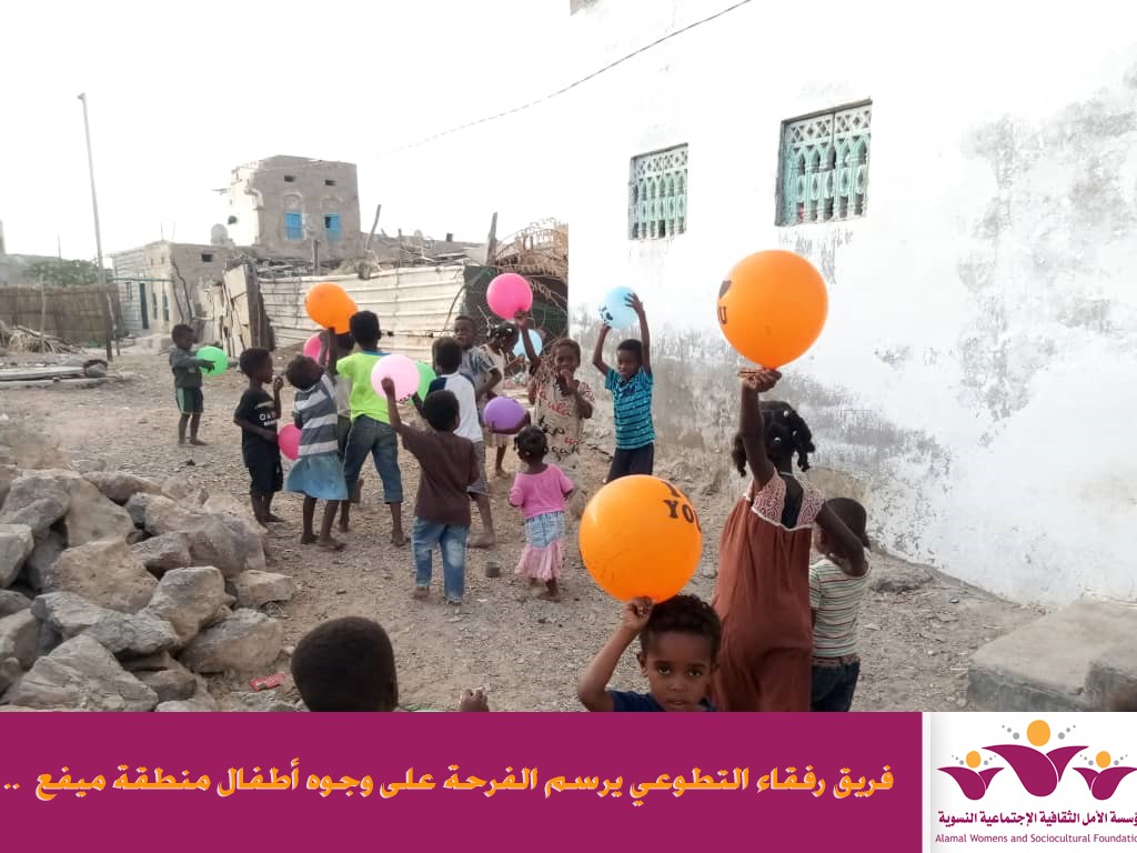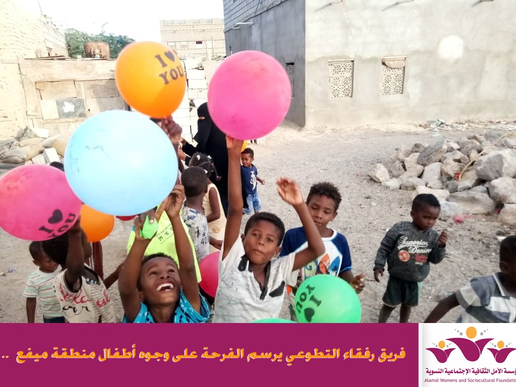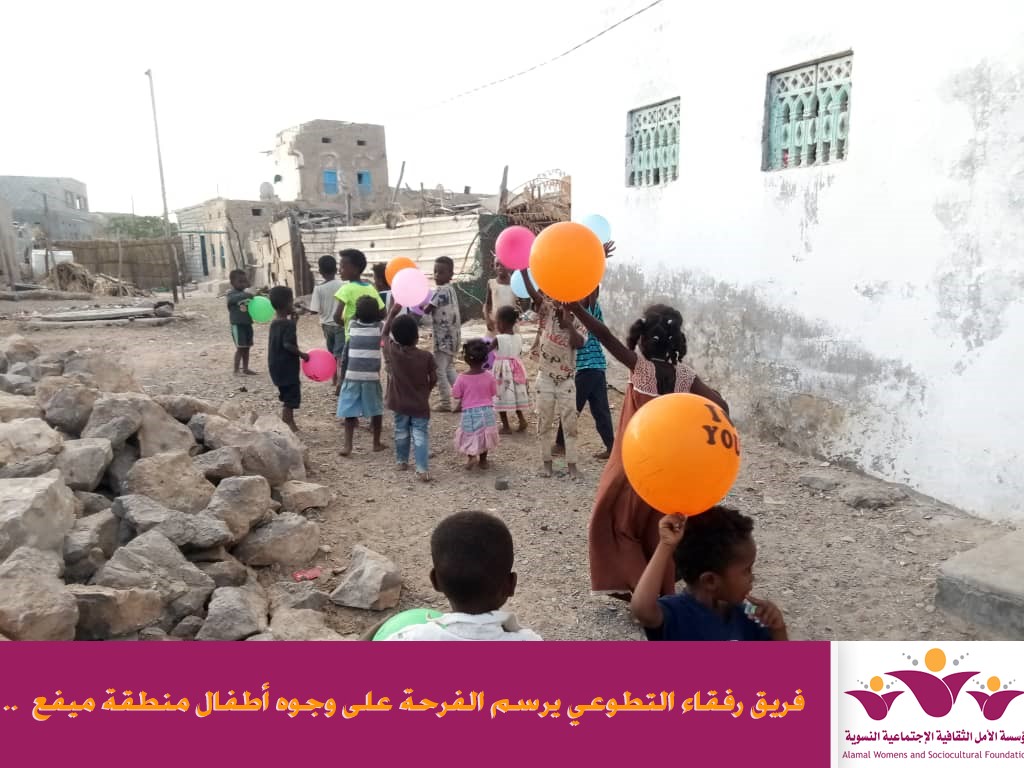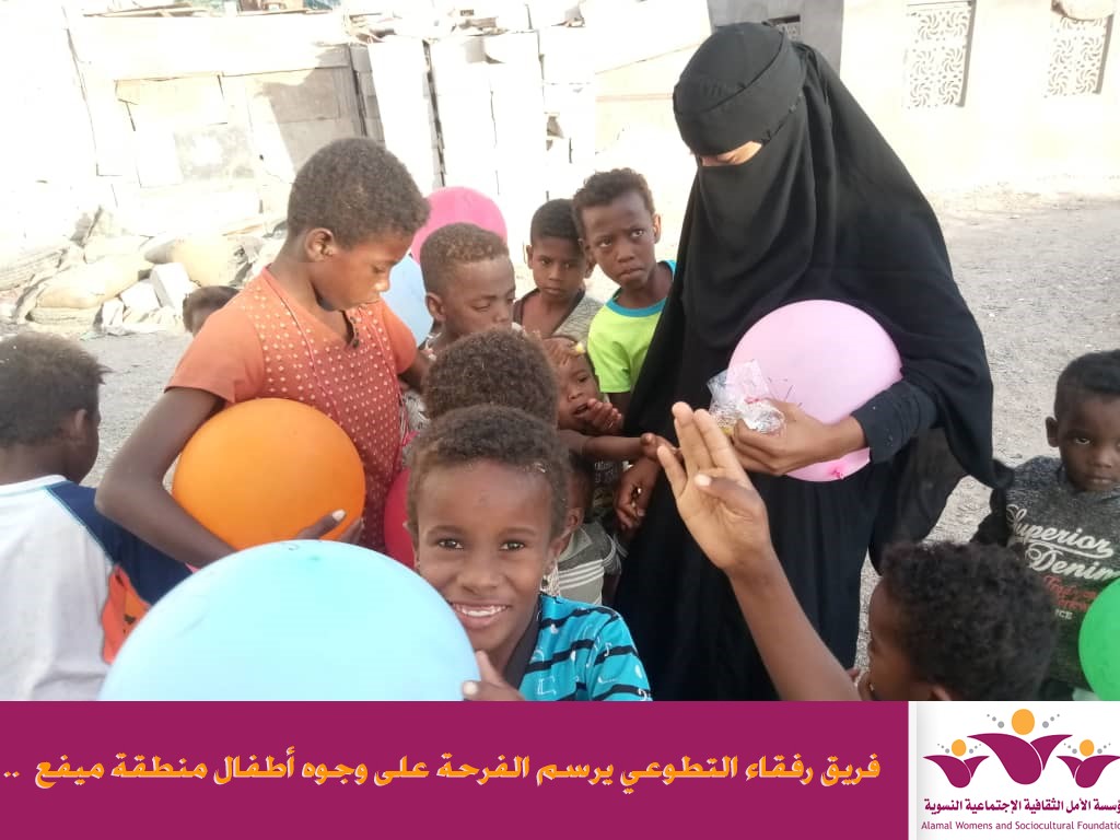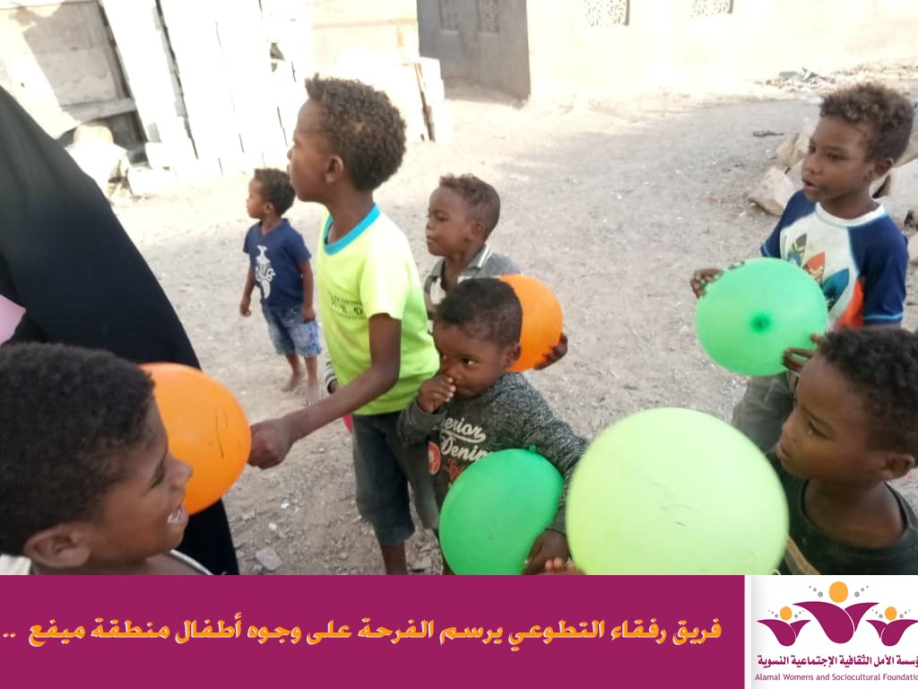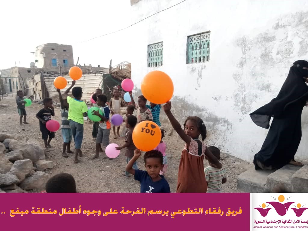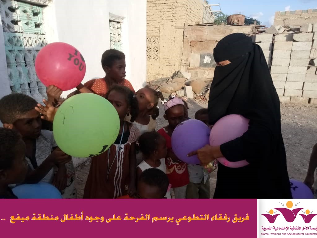 قام فريق رفقاء التطوعي التابع لمؤسسة الأمل الثقافية الاجتماعية النسوية يوم السبت الماضي يتنفيذ فعالية تطوعية إشتملت على توزيع عدد من البالونات وقطع الشوكولاتة استهدفت أطفال منطقة ميفع السفال بمديرية بروم ميفع بدعم وتمويل من الفريق وفاعلي الخير..