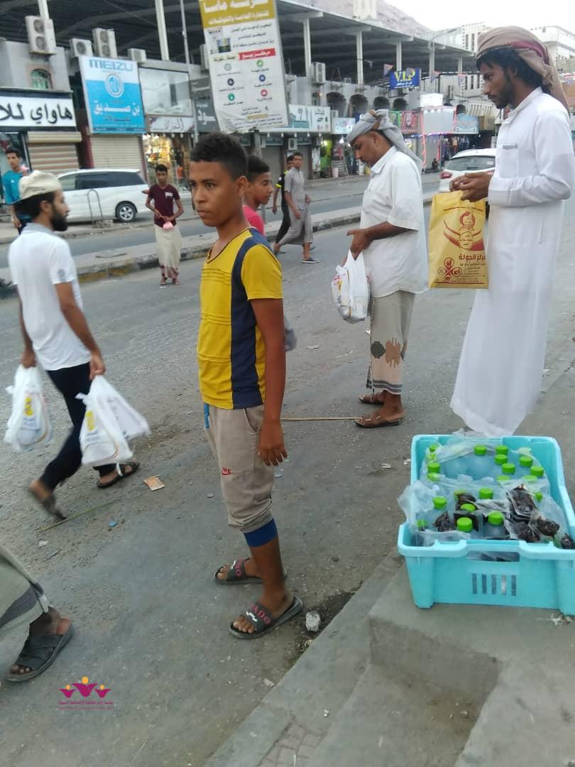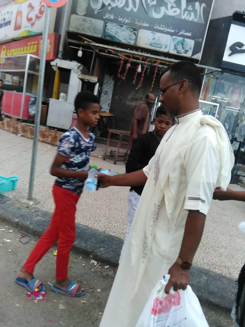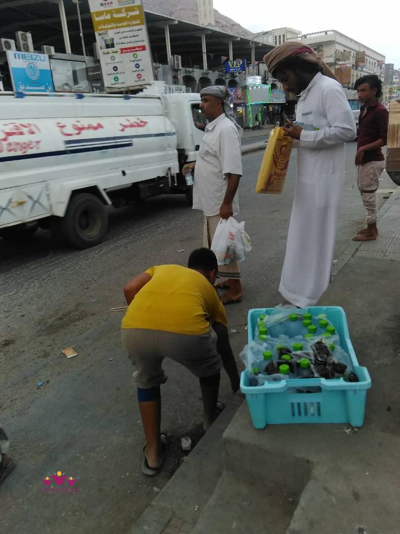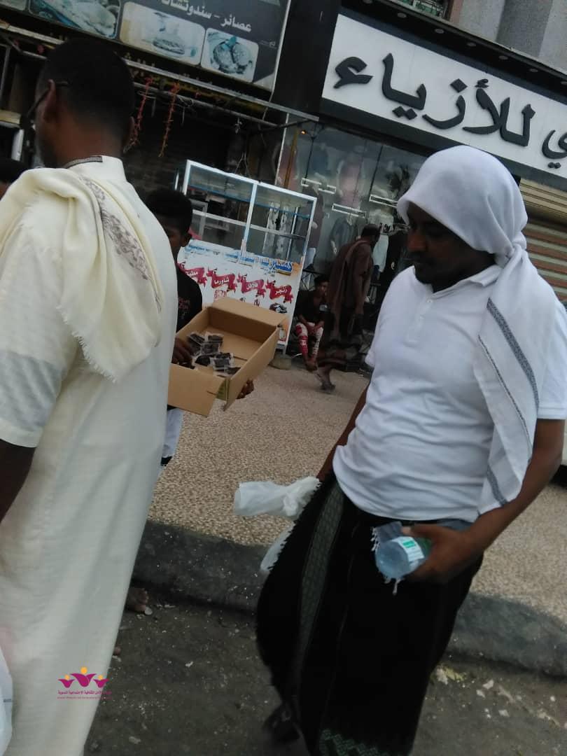 نفذ فريق رفقاء التطوعي بالمكلا التابع لمؤسسة الأمل الثقافية الاجتماعية النسوية الاثنين 6/5/2019 م حملة توزيع وجبات افطار صائم جاهزة (تمور+ماء ) على عدد من المارة الصائمين في عدد من شوارع وجولات أحياء منطقة الشرج بمدينة المكلا بدعم وتمويل من فاعل خير .