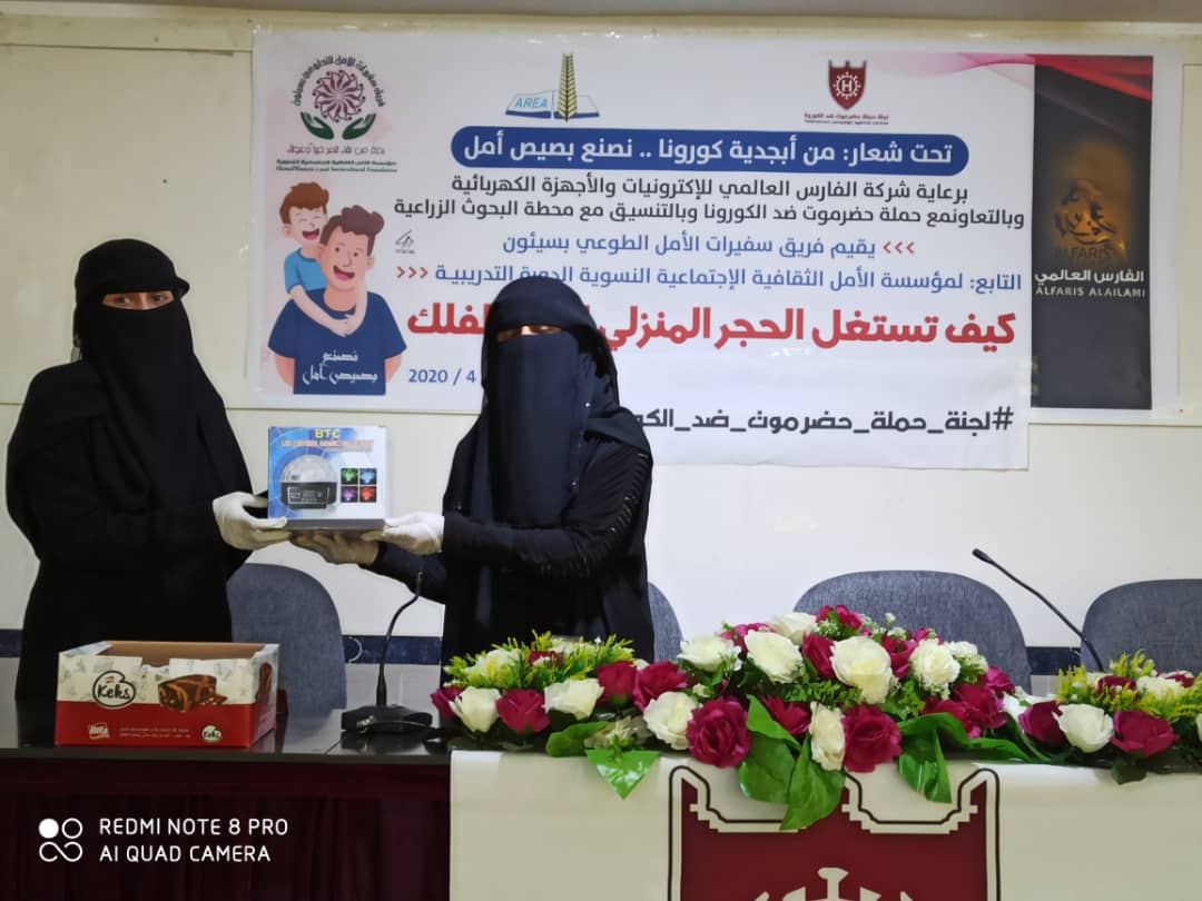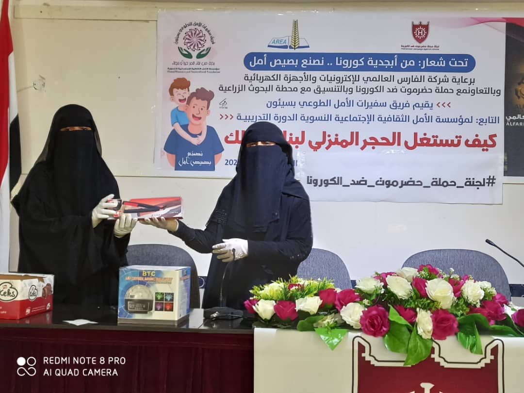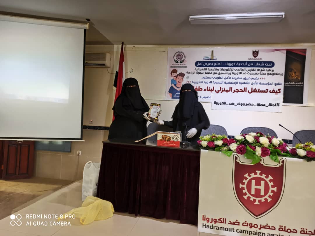 عقدت صباح اليوم بقاعة الفقيد عبدالله السبايا بمدينة سيئون الدورة التدريبية حول كيفية استغلال الحجر المنزلي لبناء طفلك للآباء والامهات بمدينة سيئون تحت شعار [ من أبجدية كورونا .. نصنع بصيص الأمل ] والتي نظمها فريق سفيرات الأمل الطوعي بسيئون التابع لمؤسسة الأمل الثقافية الاجتماعية النسوية , بدعم وتمويل المؤسسة وبالشراكة مع شركة الفارس العالمي للإلكترونيات والاجهزة الكهربائية وبالتعاون مع حملة حضرموت ضد الكورونا وبالتنسيق مع محطة البحوث الزراعية.