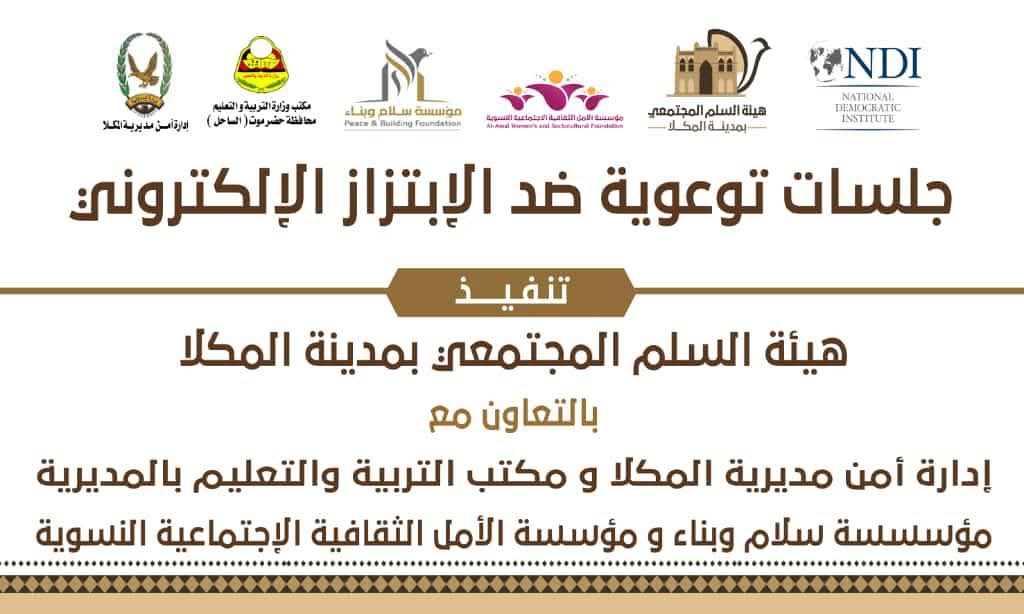 شاركت مؤسسة الأمل الثقافية الإجتماعية النسوية اليوم 17 نوفمبر 2025م في تدشين الجلسات التوعوية الخاصة بمكافحة الابتزاز الإلكتروني والتي استهدفت طالبات ثانوية الميناء للبنات وثانوية السعد العامرية للبنات بمدينة المكلا وذلك ضمن شراكة مشتركة مع هيئة السلم المجتمعي، وإدارة أمن مديرية المكلا، ومكتب وزارة التربية والتعليم بالمديرية ، وبالتعاون مع مؤسسة سلام وبناء وبتمويل من المعهد الوطني الديمقراطي NDI.