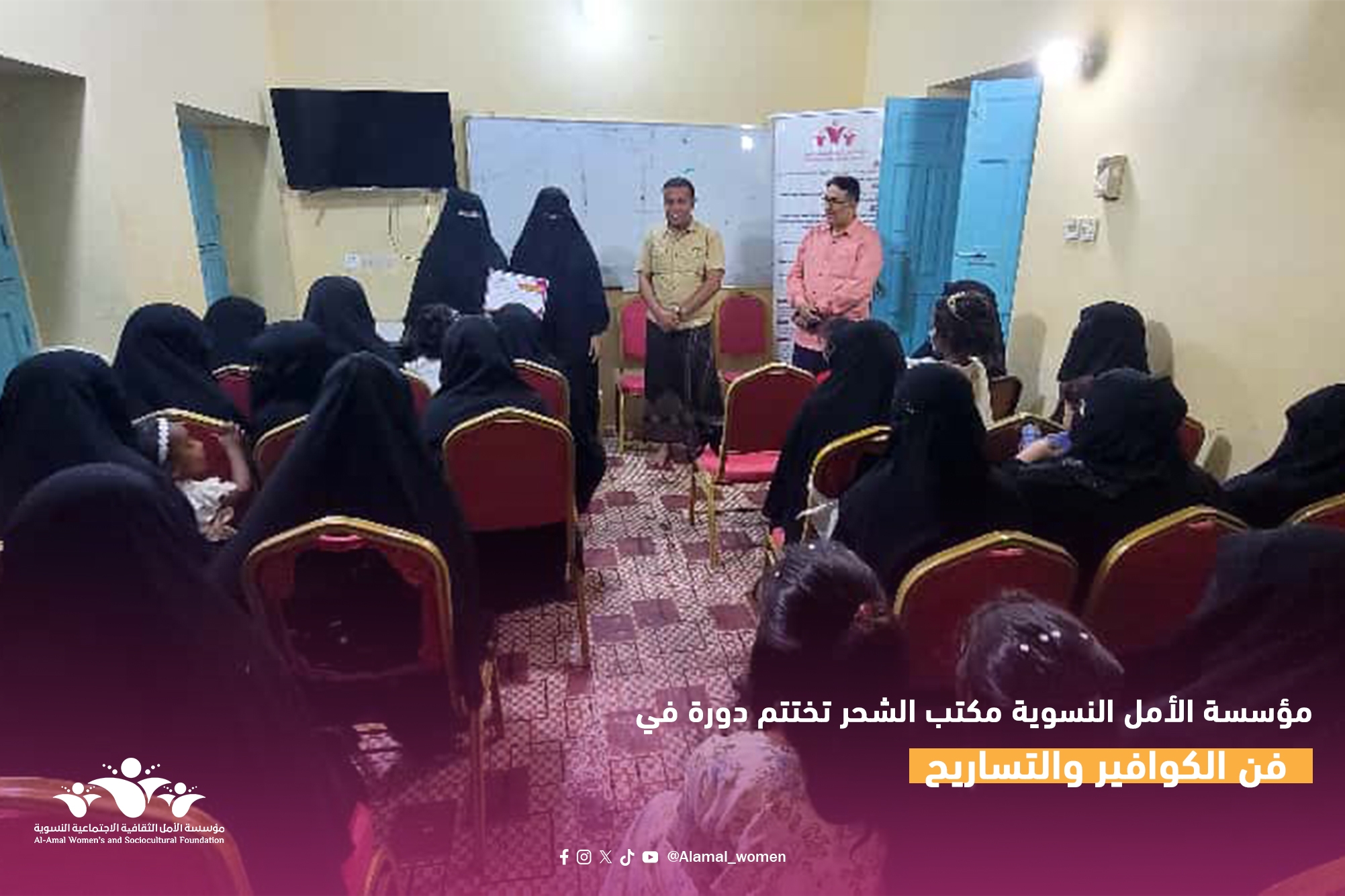 اختتمت مؤسسة الأمل الثقافية الاجتماعية النسوية – مكتب الشحر دورة تدريبية متخصصة في فن الكوافير والتساريح بمشاركة 35 امرأة وذلك في إطار جهود المؤسسة لتمكين النساء اقتصاديًا وتعزيز مهاراتهن المهنية.