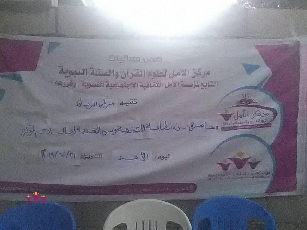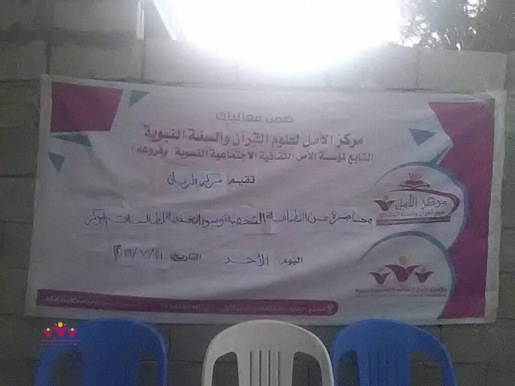 أقام مركز الامل بمنطقة الريان بغيل باوزير التابع لمركز الامل لعلوم القران والسنة النبوية محاضرة توعوية بعنوان النظافة الشخصية وسوء التغذية وذلك يوم الاحد الموافق ٢١/7/2019م عدد الحضور ٤٠ مستفيدة تم تنفيذ هذه المحاضرة من قبل فريق تابع لمنظمة اليونسف
