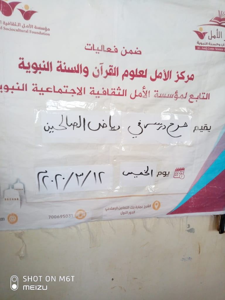 قام مركز الأمل بمنطقة الريان التابع لمؤسسة الامل الثقافية الاجتماعية النسوية بعمل محاضرة يوم الخميس الموافق ١٢/٣/٢٠٢٠م شرح درس من كتاب رياض الصالحين (عن فضل قراءة القرآن) القته أ/ حياة قايد سعيد حيث استهدف هذا ٣٠ طالبة من المركز