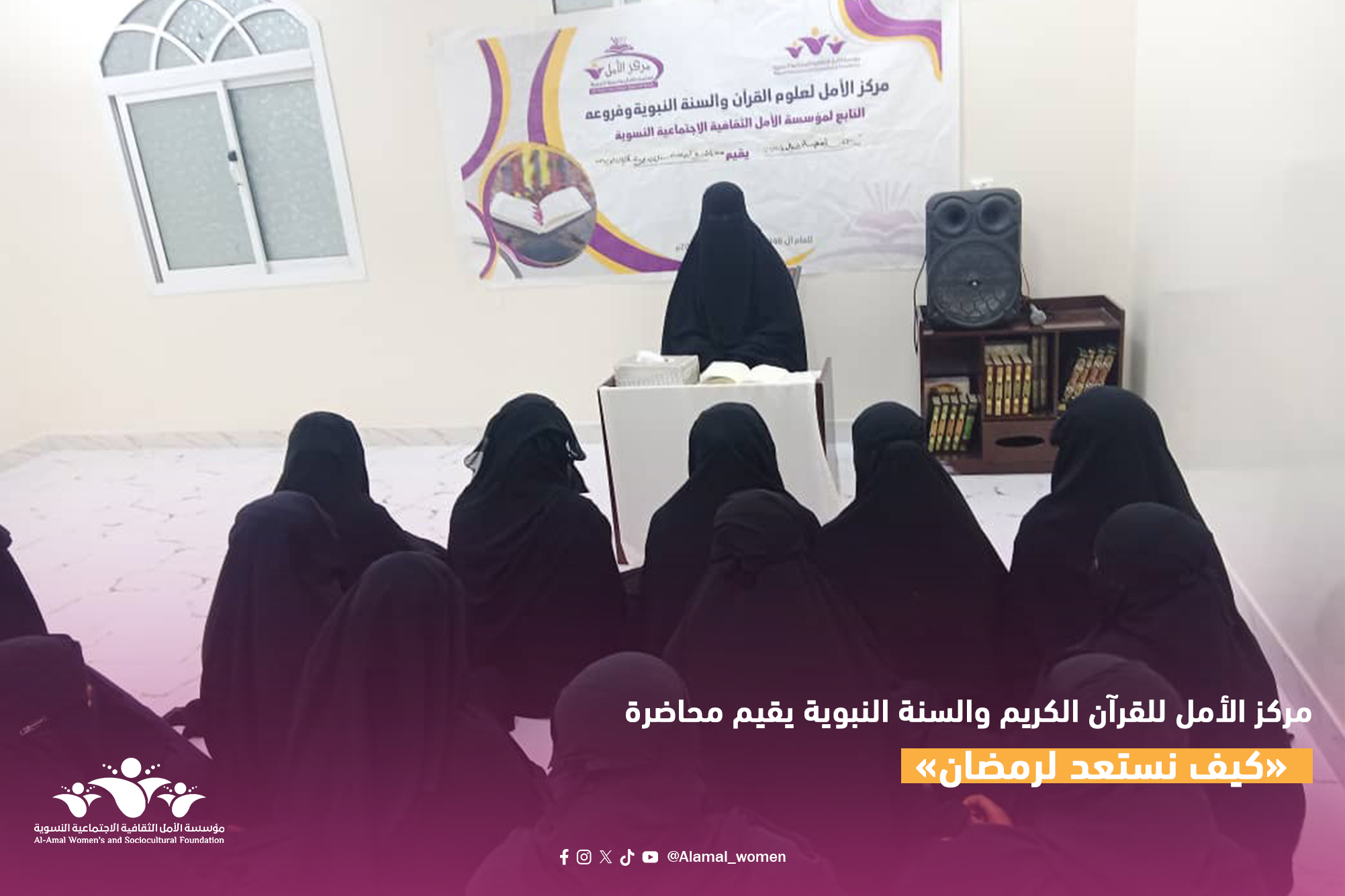 أقام مركز الأمل للقرآن الكريم والسنة النبوية التابع لمؤسسة الأمل الثقافية الاجتماعية النسوية يوم الاثنين الموافق 29 ديسمبر 2025م محاضرة إيمانية بعنوان «كيف نستعد لرمضان»، وذلك ضمن برامجه التوعوية الهادفة إلى تعزيز الوعي الديني والاستعداد الروحي لشهر رمضان المبارك.