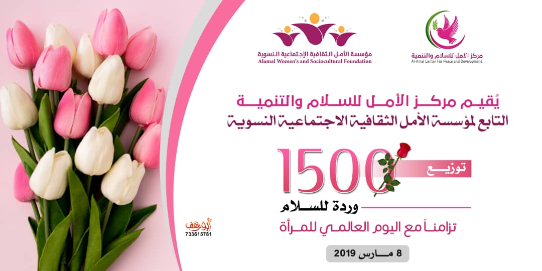 وزع أعضاء مركز الامل للسلام والتنمية التابع لمؤسسة الأمل الثقافية الاجتماعية النسوية مساء الجمعة 1500 وردة بمناسبة اليوم العالمي للمرأة في مدينة المكلا.