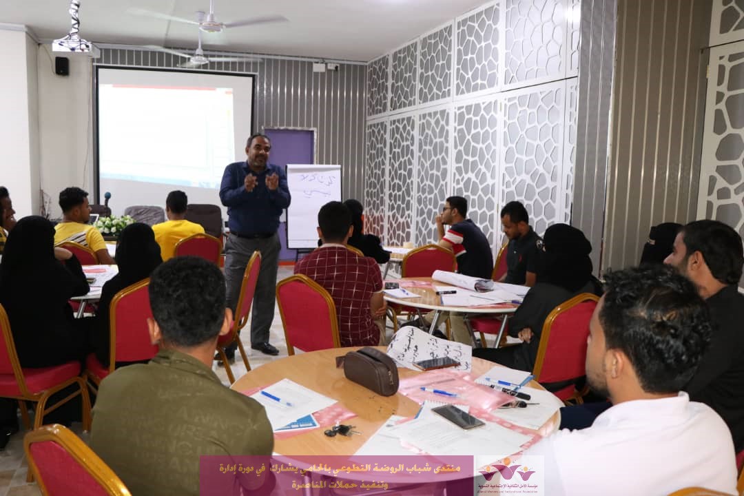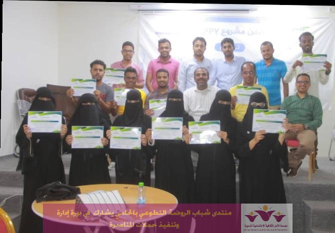 شارك منتدى شباب الروضة التطوعي بالحامي التابع لمؤسسة الأمل الثقافية الاجتماعية النسوية في ورشة العمل التدريبية حول إعداد وتنفيذ وإدارة حملات المناصرة والتي نظمتها مؤسسة بيت التنمية بالشراكة مع مؤسسة رنين اليمن إمتداداً لمشروع تعزيز السلام في اليمن APPY ..